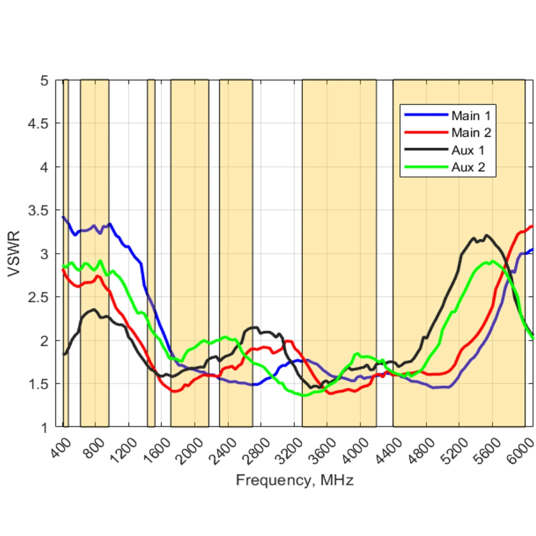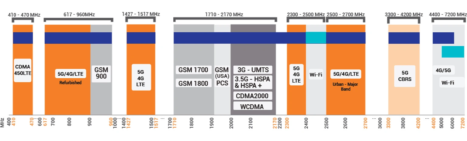 410 - 470, 617 - 960, 1427 - 1517, 1710 - 2170, 2300 - 2500, 2500 - 2700, 3300 - 4200, 4400 - 7200