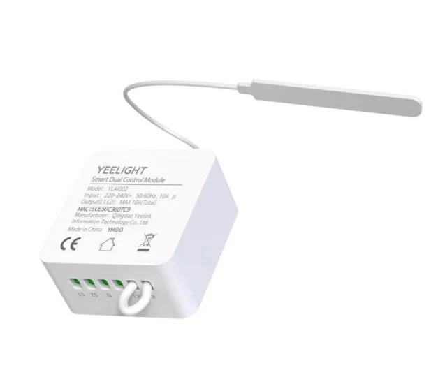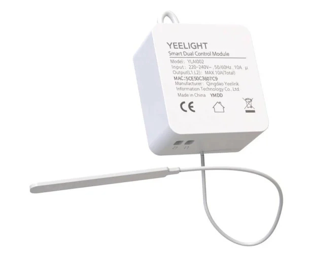 Duální řídicí modul Yeelight mění tradiční elektrické spotřebiče, jako je osvětlení a větrání, na inteligentní systémy, které lze ovládat na dálku. Díky připojení WiFi a Bluetooth jej lze ovládat pomocí aplikace, dálkového ovládání a hlasových příkazů (Google Home, Alexa, SmartThings).