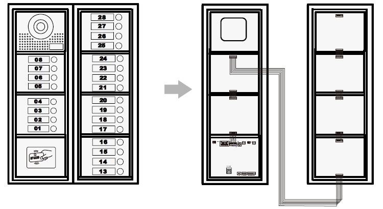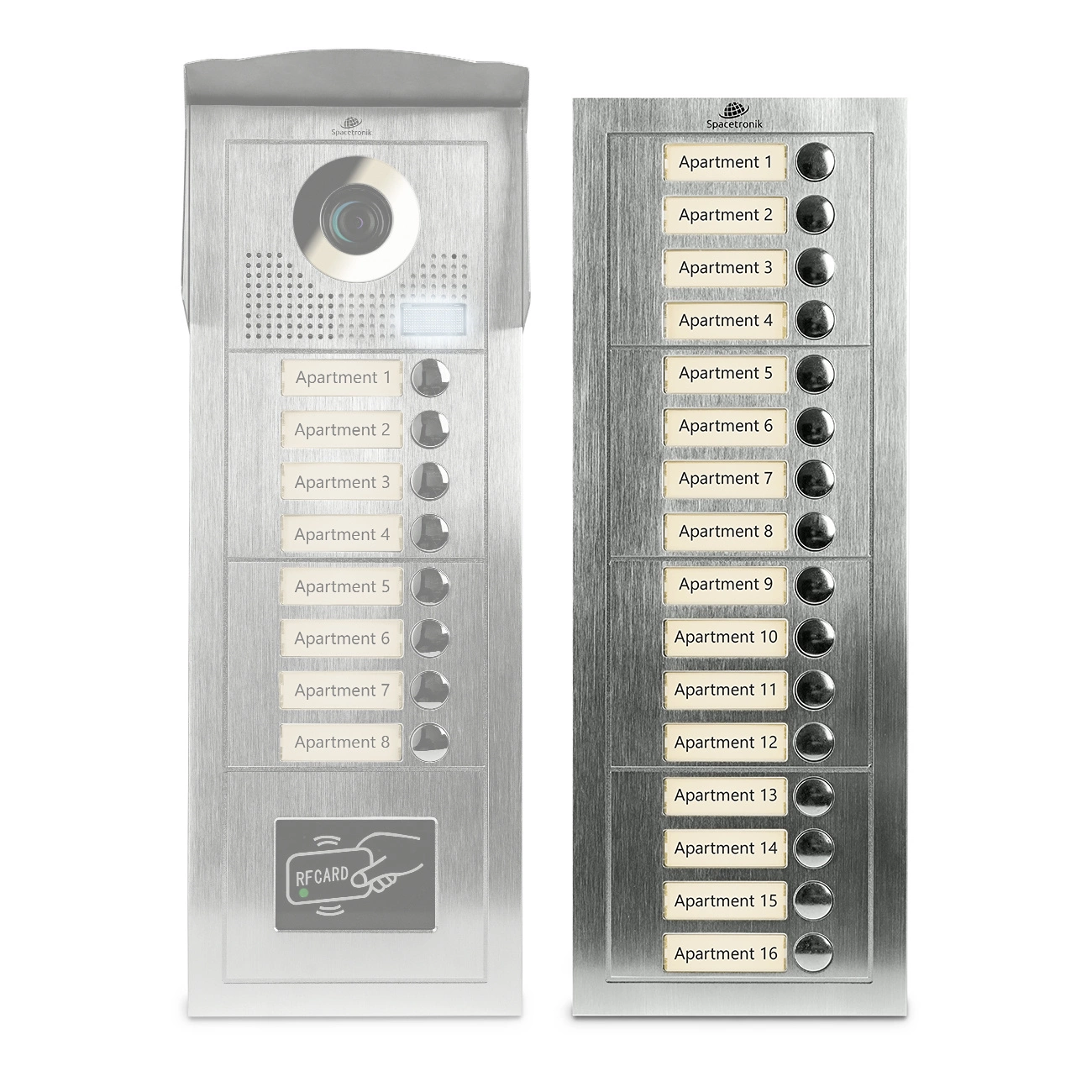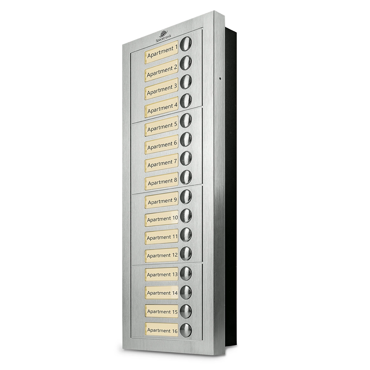 Dodatkowy panel szesnastorodzinny do rozbudowy systemu Spacetronik DiO. Panel wyróżnia się estetycznie wykonaną wandaloodporną obudową ze stopu aluminium, w którą wkomponowane zostały podświetlane szyldy. Podświetlenie nocne LED pozwala na komfortowe korzystanie z urządzenia w warunkach niedostatecznej widoczności.