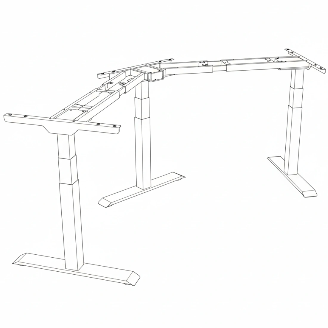 Wszechstronna rama elektrycznego stelaża oprócz regulacji góra/dół oraz przekształcenia do trzech wariantów, pozwala na podwójną ręczną regulację horyzontalną (w bok). W łatwy sposób rozszerzysz konstrukcję pod wymiar swojego blatu. Sugerowane wymiary blatu: dla 90° 1300 - 1900 mm (2 strony), 600 - 800 mm; dla 120° 1100 - 1800 mm, 600 - 800 mm; dla 180° 1700 - 2900 mm, 600 - 1000 mm.