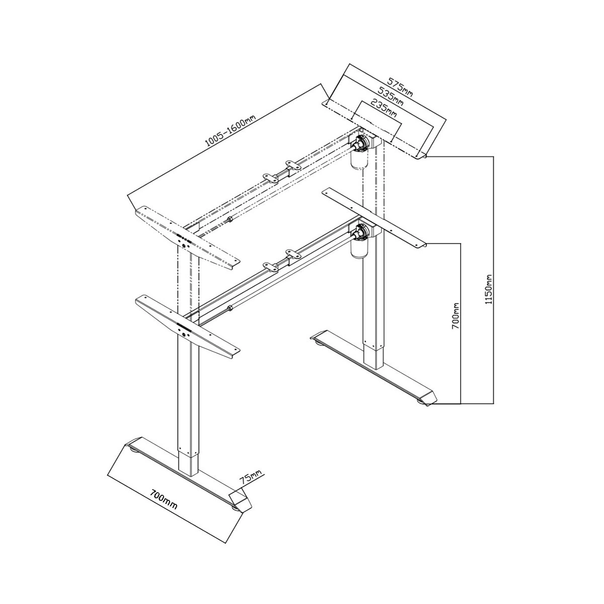 Wszechstronna rama elektrycznego stelaża oprócz regulacji góra/dół pozwala na ręczną regulację horyzontalną (w bok). W łatwy sposób rozszerzysz konstrukcję pod wymiar swojego blatu. Sugerowane wymiary blatu: 1200-2000 mm (szerokość), 600-800 mm (głębokość).