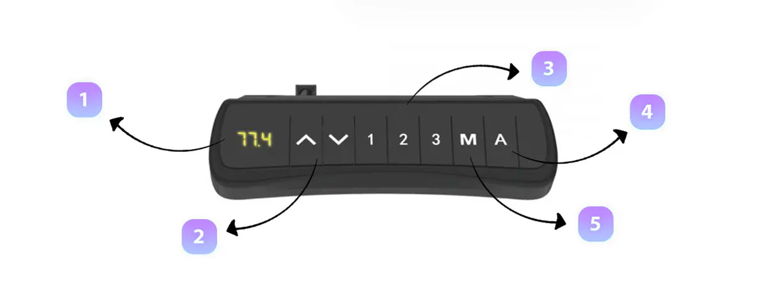 1. Wyświetlacz LED 2. Przyciski góra/dół 3. Programowalne przyciski do zapisania 3 pozycji 4. Przycisk alarmu 5. Przycisk pamięci