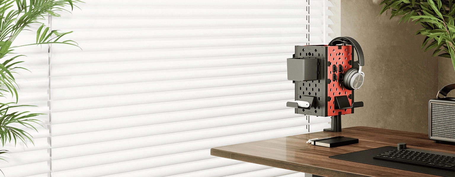 Kromě 4 modulárních perforovaných dílů sada obsahuje držáky na psací potřeby, držáky na šálky, držáky na podložky, dva typy držáků na sluchátka a držáky na kabely. Jedná se o kompletní stolní držák, s jehož pomocí si snadno uspořádáte příslušenství na pracovním stole. Záleží jen na vás, kam jednotlivé držáky připevníte a jak je budete používat.