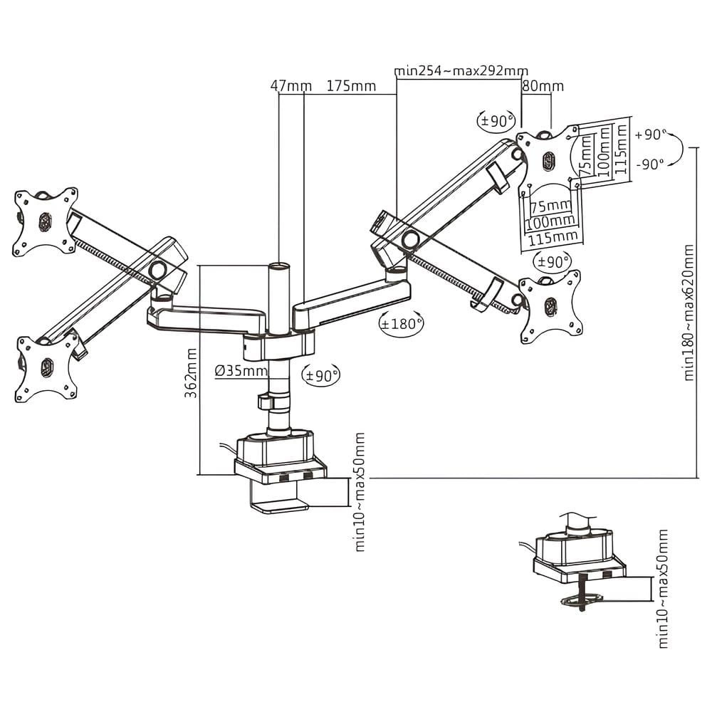 Držák monitoru SPA-H120 je vybaven dvěma typy montážních úchytů. To vše pro ochranu vašeho nábytku. K dispozici jsou dvě možnosti montáže: průchozí a upínací. Zejména druhá možnost se může mnohým zdát zajímavá. Svěrná montáž se vyznačuje tím, že není třeba vrtat. Stačí se jen ujistit, že máte stůl se správnou kompatibilní tloušťkou desky (10-50 mm). Absence nutnosti vrtání znamená, že držák můžete bez problémů přesouvat ze stolu na stůl. Přitom nezanecháte žádné známky používání.