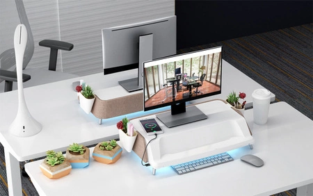 Przekształć swoje tradycyjne biurko w ergonomiczne stanowisko pracy. Ta designerska stacja robocza podnosi monitor do komfortowego poziomu widzenia, eliminując niepotrzebne zmęczenie szyi i oczu. Zyskaj większy komfort pracy przy biurku i utrzymaj porządek - przechowuj niezbędne przybory biurowe w szufladzie. Dzięki portowi USB możesz ładować swojego smartfona. Światło UV pod spodem zapewnia szybką i skuteczną inaktywację mikroorganizmów. Wbudowana lampa ultrafioletowa bakteriobójcza i wirusobójcza umożliwia zdezynfekowanie m.in. telefonu, długopisu oraz większych biurowych urządzeń, jak klawiatura czy myszka. Dodatkowo z boku znajduje się jedno gniazdo USB-A, za pomocą którego można np. naładować smartfon.