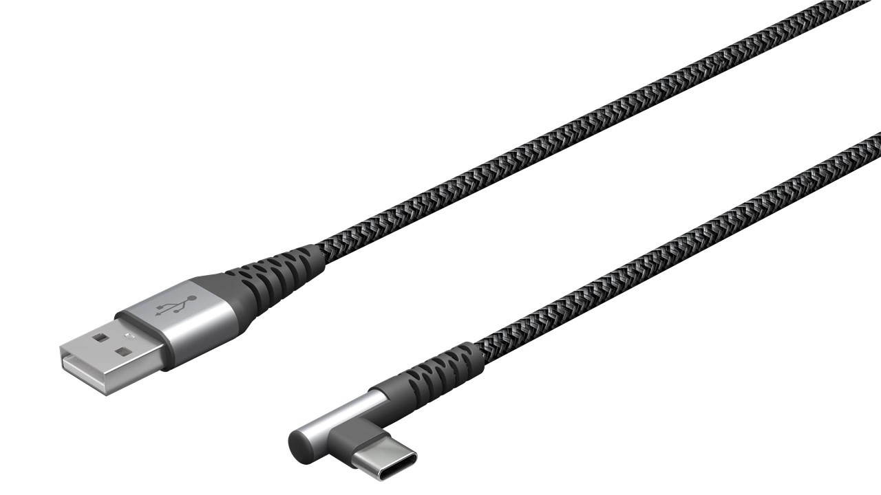 Textilní kabel USB-C na USB-A s kovovými zástrčkami (hvězdicově šedý/stříbrný) v úhlovém provedení, elegantní a mimořádně odolný.