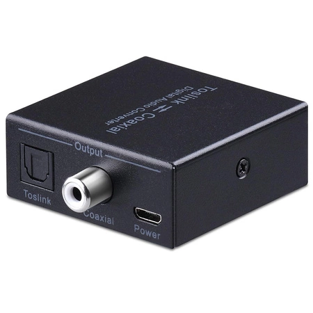 Konwerter pozwalający na połączenie urządzeń z wyjściem coaxial digital audio z urządzeniem posiadającym wyjście Toslink oraz odwrotnie. Urządzenie konwertuje sygnał coaxial na toslink oraz sygnał toslink na coaxial Posiada wsparcie Dolby Digital i DTS audio
