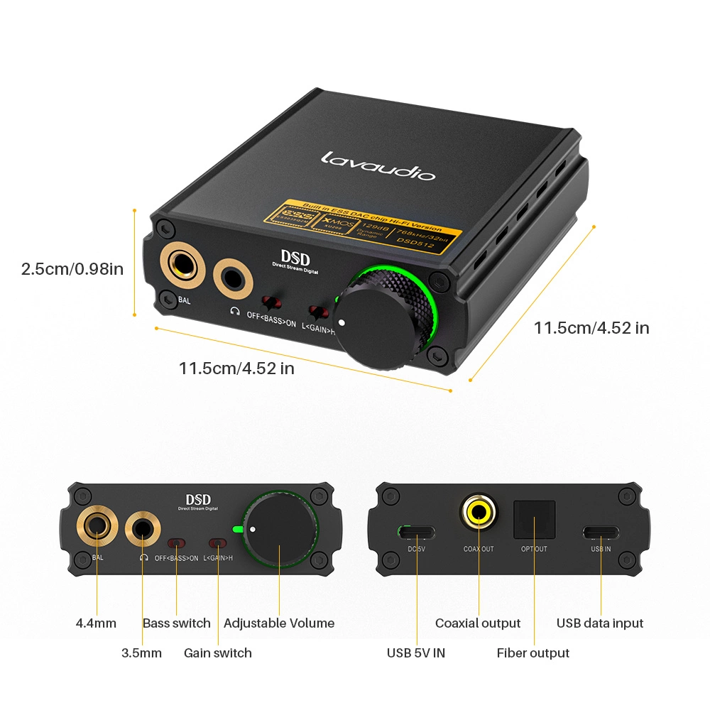 • Audio přijímač Digitální převodník zvuku z počítače na USB-C DAC čip ES9038Q2M Vstupy USB-C: Tonsilk, koaxiální, Jack 3,5 a Jack 4,4 Napájení USB-C