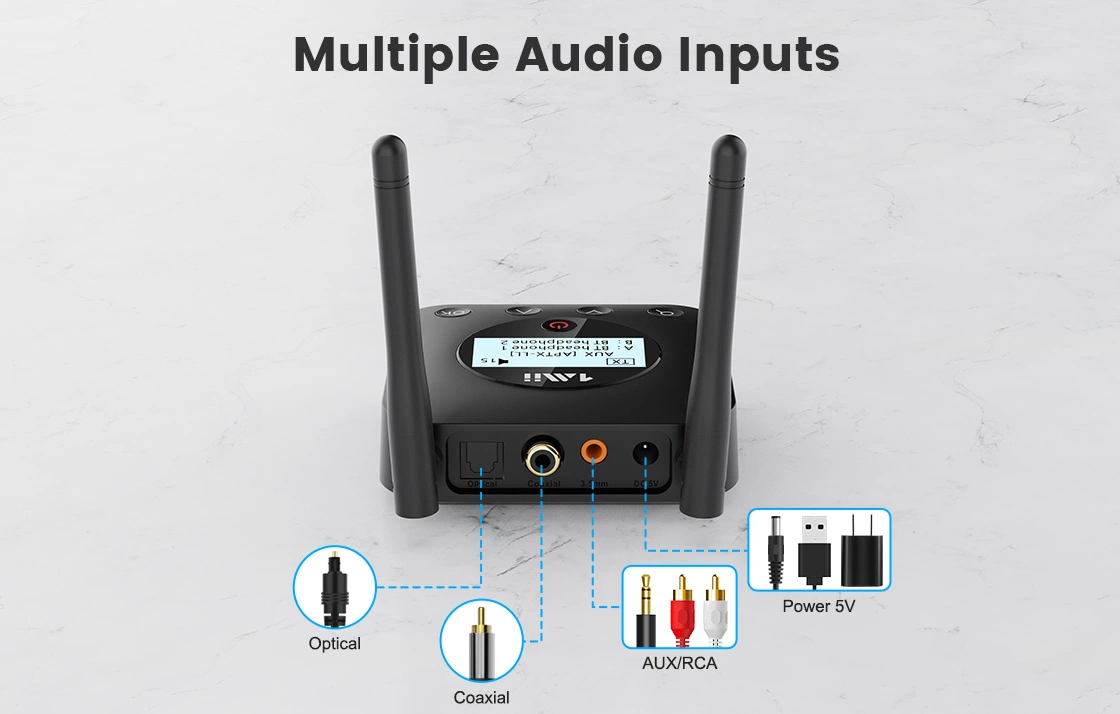 Elastyczne połączenia audio 1Mii B06TX plus nadajnik Bluetooth dalekiego zasięgu Obsługuje cyfrowe standardy wyjściowe audio OPTYCZNE / KONCENTRYCZNE / AUX 3,5 mm, dzięki czemu jest kompatybilny z 99% telewizorów, odbiorników, projektorów dostępnych na rynku.
