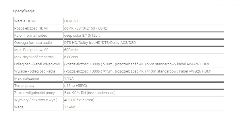 - Podpora vstupu až 10 metrů standardního kabelu HDMI délky AWG26, výstupu až 15 metrů kabelu AWG26 (při zvoleném rozlišení 4k vstup až 5 metrů, výstup až 10 metrů.