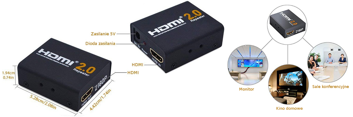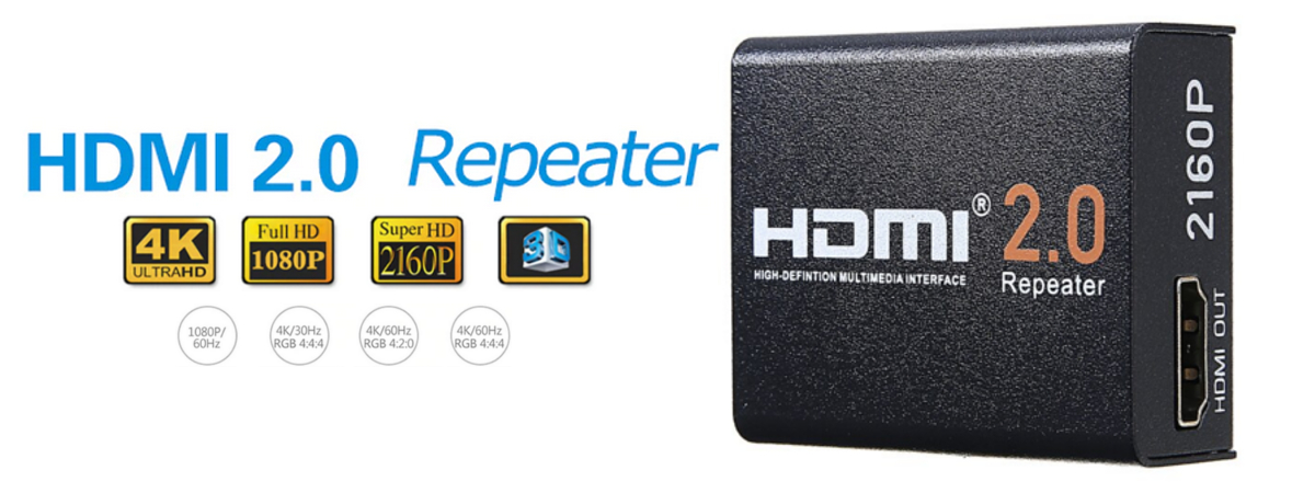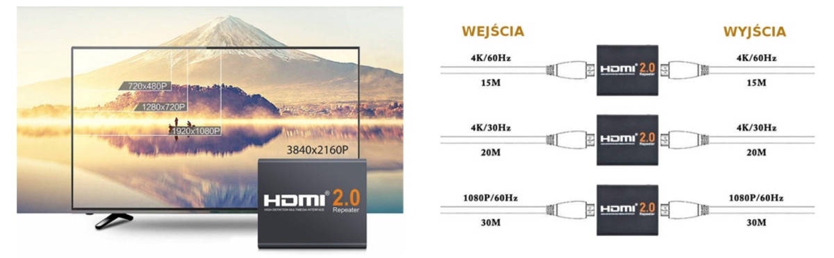 Urządzenie egeneruje przychodzący sygnał HDMI przez dekodowanie i ponowne kodowanie go do nowego standardu sygnału HDMI, dzięki czemu może przedłużyć zasięg transmisji bez degradacji. Rozszerza sygnał 4K (4096x2160P) do transmisji na odległości do 60 metrów ( niższa rozdzielczość sygnału może być przesyłana dalej). Produkt idealnie nadaje się do przedłużania transmisji danych np. w salach prezentacyjnych, salach konferencyjnych czy też w środowiskach szkoleniowych. Repeater jest zgodny ze standardem HDMI 2.0 który działa wstecz, zapewniając zgodność z poprzednimi wersjami HDMI. Dzięki wzmocnieniu sygnału, może przesyłać informacje za pomocą kabli o łącznej długości do 60m! Obsługuje również UHD 4K dla kabli HDMI o AWG24.