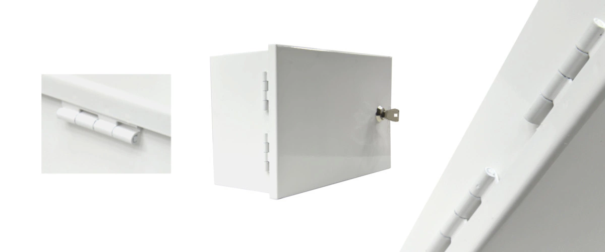 Szafka wykonana bez widocznych spawów (gładki front i boki szafki). Szafka posiada z tyłu metalową płytę montażową