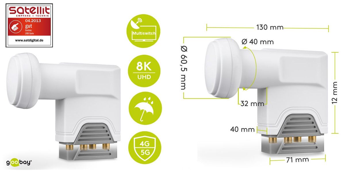 Konwertery satelitarne marki Goobay to przede wszystkim wysoka jakość wykonania. Seria obejmuje wszystkie popularne wersje LNB: single, twin, quad, quatro i octo. Konwerter służy do odbioru sygnału satelitarnego, jest to wymagane akcesorium do standardowej anteny satelitarnej.