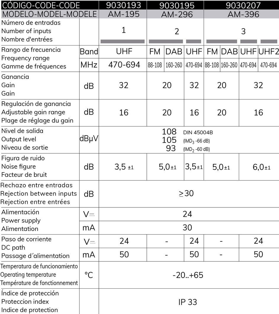 Szerokopasmowe wzmacniacze masztowe obsługujące sygnały telefonii komórkowej LTE700 i LTE800 z pasmem wzmocnienia UHF 470-694 MHz. Posiadają trzy wejścia do wzmacniania i łączenia sygnałów z anten. Zasilane są przewodem koncentrycznym z zasilacza zainstalowanego wewnątrz budynku. Zawierają przełączaną ścieżkę prądu stałego, umożliwiającą zasilanie przedwzmacniacza. Idealne zastosowanie do instalacji cyfrowych i analogowej telewizji naziemnej, na które oddziałuje transmisja sygnałów telefonii komórkowej LTE700 i LTE800 i które wymagają dużego wzmocnienia. Wzmacniają i mieszają sygnały z kilku anten. Uzyskany sygnał może być dystrybuowany do dużej liczby gniazd telewizyjnych za pomocą jednego kabla koncentrycznego.