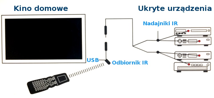 Aby wygodnie używać przekaźnika pilota, należy przykleić odbiornik (taśma dołączona do urządzenia) w konfortowym miejscu. Nadajniki IR należy przykleić w taki sposób, aby przykrywały "okienko" podczerwieni na urządzeniu. Umieszczenie dwóch nadajników podczerwieni na tym samym komponencie nie poprawi wydajności, ponieważ jeden nadajnik steruje urządzeniem gospodarstwa domowego i nie ingeruje w siebie nawzajem. Urządzenie zasilane za pomocą USB.