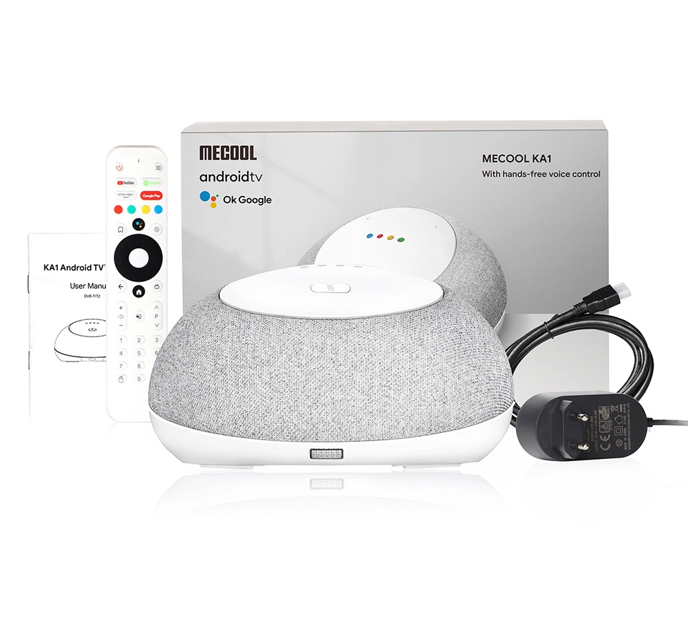 Mecool KA1 to w pełni funkcjonalny Android Box z Androidem w wersji 11. Urządzenie wyposażone jest w 32GB pamięci wbudowanej i 4GB pamięci operacyjnej RAM. Dodatkowo, wyposażony jest w głowicę naziemno-kablową pozwalającą odbierać sygnał DVB-T2/C i cieszyć się darmową telewizją naziemną. Model KA1 to coś więcej niż tradycyjny Android Box, to bezdotykowy głośnik z systemem Android TV, którym można sterować głosowo nawet z odległości 5m. Oczywiście, w komplecie znajduje się też dedykowany pilot ze skrótami do ulubionych aplikacji.