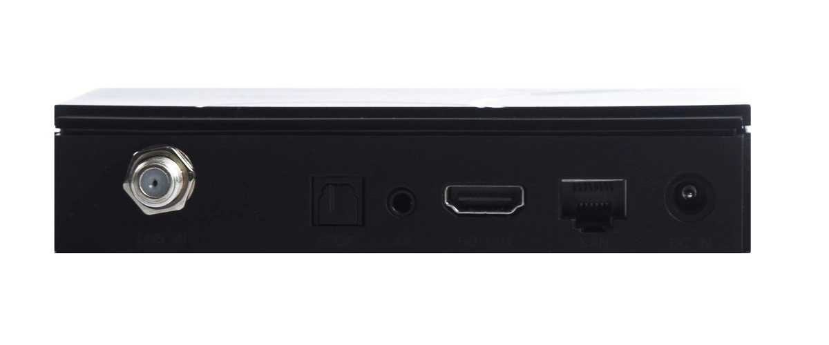 0a, vysoce kvalitní digitální zvukový výstup SPDIF, kompozitní analogový video výstup přes MiniJack a samozřejmě vstup satelitního tuneru DVB-S2 podporující potřebné přepínací protokoly DiSEqC a Unicable . Nechybí ani vestavěná čtečka karet (pro karty s podmíněným přístupem) a připojení externího infračerveného přijímače.