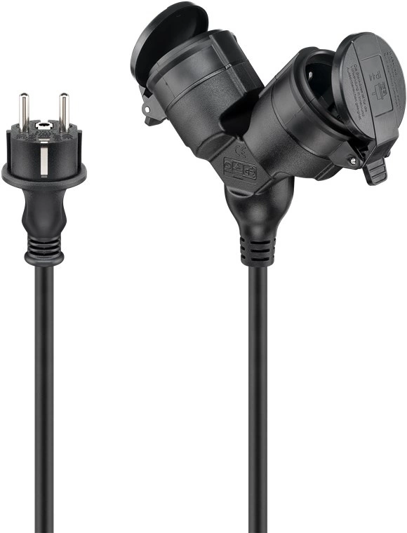 Prodlužovací kabel pro napájení domácích spotřebičů v interiéru i exteriéru a pro vybavení kabelových bubnů. Praktické řešení pro zdvojení jedné zásuvky. Odolný proti stříkající vodě podle IP44, vhodný do vlhkých místností a pro dočasné venkovní použití, např. jako napájecí kabel pro sekačky na trávu.