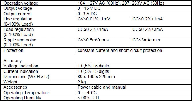 • Laboratorní napájecí zdroj s nastavitelným výstupním napětím 0-15 V.Proudová intenzita 0-3 A. Výkon 45 W. Nový model
