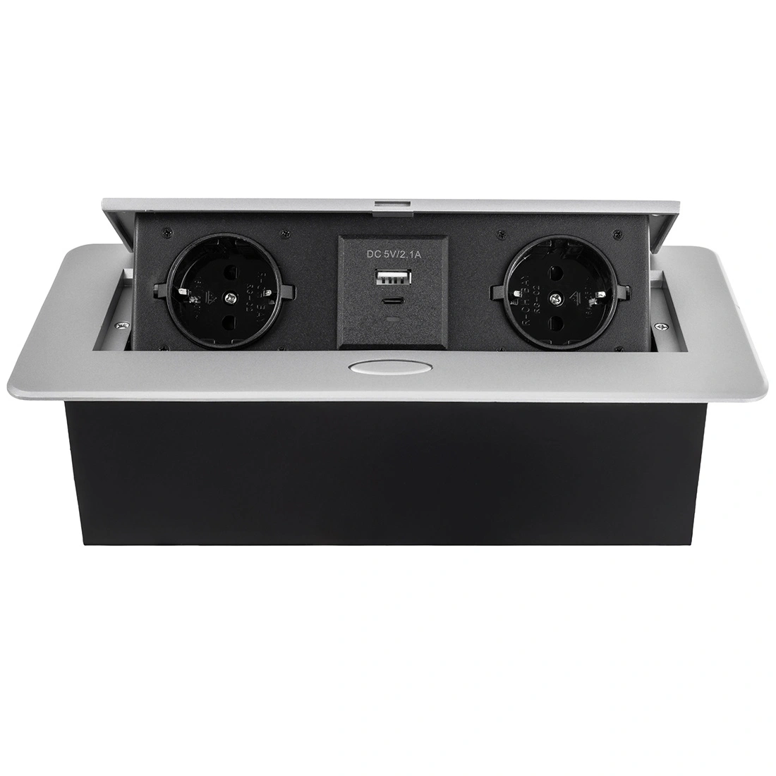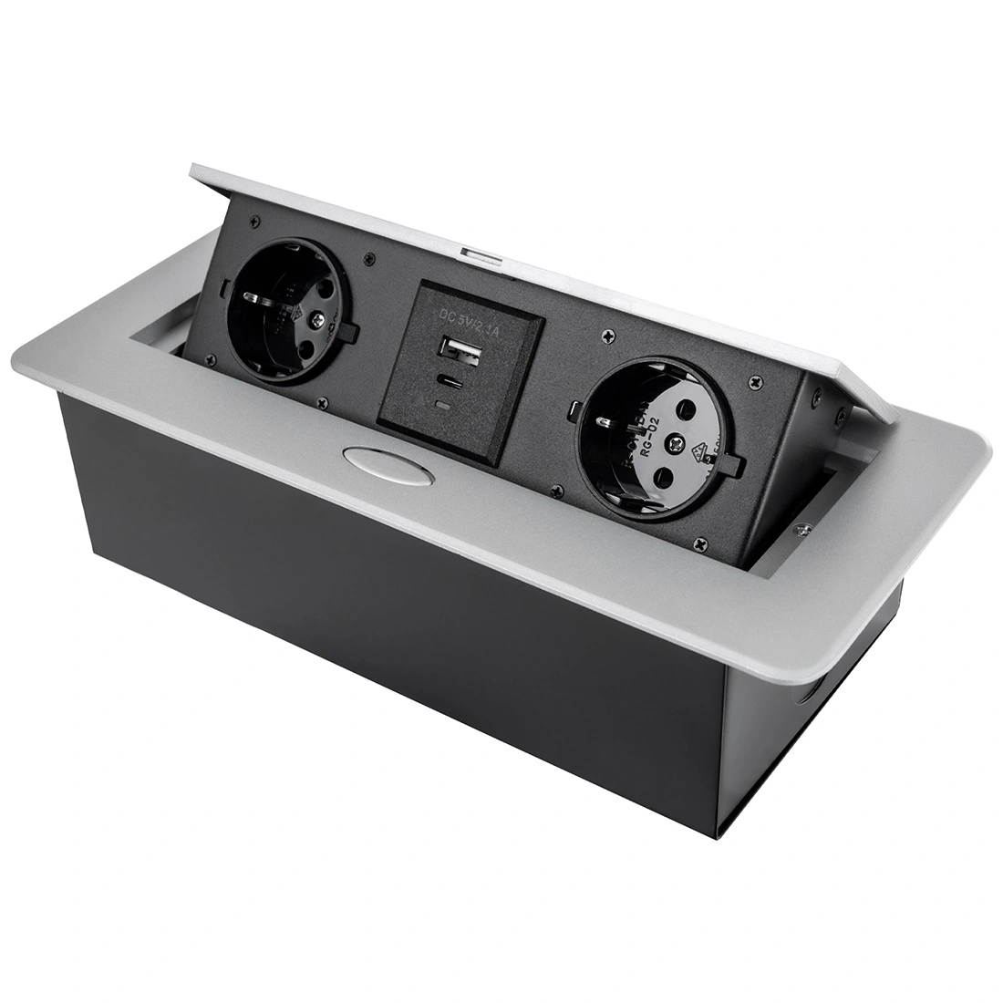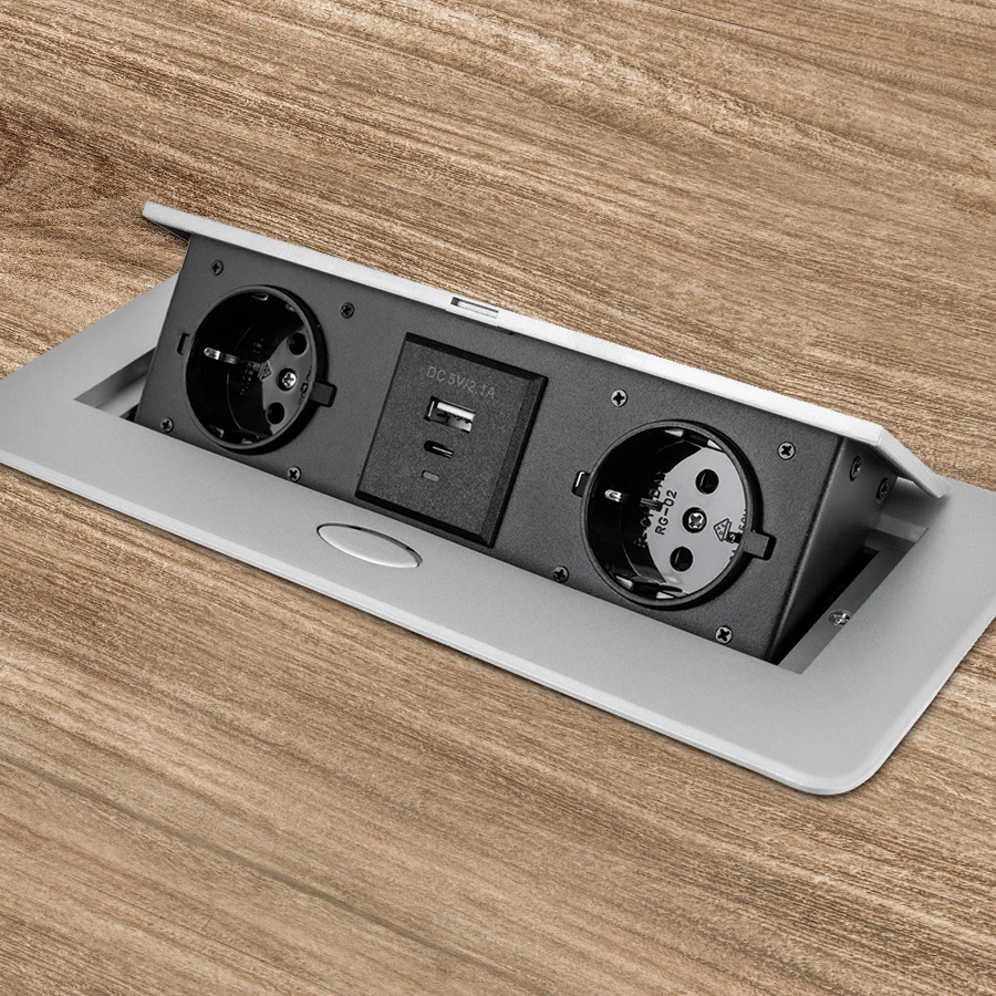 Mediaport Spacetronik ERGOLINE SPS-D24S V2 to nowoczesne rozwiązanie, które znajduje zastosowanie w sklepach, salonach sprzedaży, salach konferencyjnych, biurach a także w domu. Naciśnij przycisk, a gniazda płynnie się otworzą. Wykonany z aluminium i wysokiej jakości komponentów. Produkt jest przeznaczony do montażu wewnątrz pomieszczeń w biurkach, blatach i stołach, zarówno w pozycji pionowej jak i poziomej, zapewniając dostęp do gniazd. Mediaport został wyposażony w 2 gniazda 110-250 V (typ Schuko) oraz podwójną ładowarkę USB.