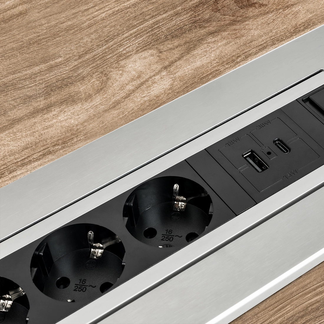 Nábytková zásuvka s povrchovou úpravou z broušeného kovu je kombinací elegance a odolnosti, která skvěle doplní moderní interiéry. Takové provedení dodává zásuvce luxusní vzhled a zároveň zajišťuje odolnost proti poškrábání a jinému mechanickému poškození. Ideální do kuchyní, kanceláří nebo obývacích pokojů, kde je důležitá funkčnost i design.