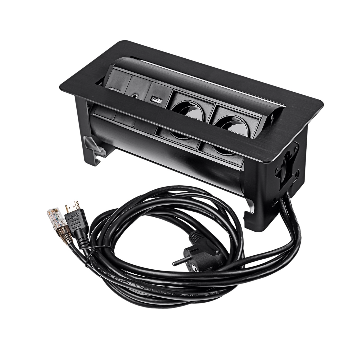 Mediaport Spacetronik SPS-O26B V2 to nowoczesne rozwiązanie, które znajduje zastosowanie w sklepach, salonach sprzedaży, salach konferencyjnych, biurach, a także w domu. Obróć, a gniazda płynnie się odkryją. Wykonany z aluminium i wysokiej jakości komponentów. Produkt jest przeznaczony do montażu wewnątrz pomieszczeń w biurkach, blatach i stołach, zarówno w pozycji pionowej jak i poziomej, zapewniając dostęp do gniazd. Mediaport został wyposażony w 2 gniazda 110-250 V (typ Schuko), podwójną ładowarkę USB, gniazdo HDMI 2.0 oraz RJ-45 (dla kategorii 6).