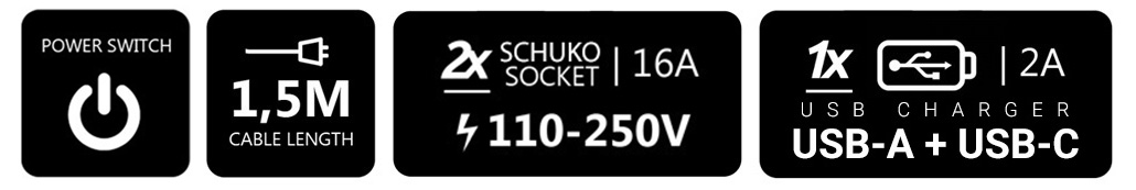 - 2x gniazdo typu niemieckiego 110-250 V (16 A)- 1x podwójna ładowarka USB (USB-C + USB-A)