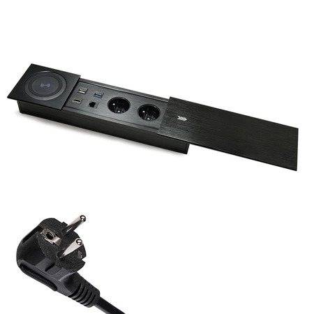 • Elegancki mediaport do montażu w blacie, zasuwany. Posiada 2 gniazda elektryczne, port USB 2.0, port USB 3.0, gniazdo HDMI, gniazdo Ethernet (RJ-45) oraz szybką ładowarkę indukcyjną. Długość kabla 1,5 m. W kolorze czarnym