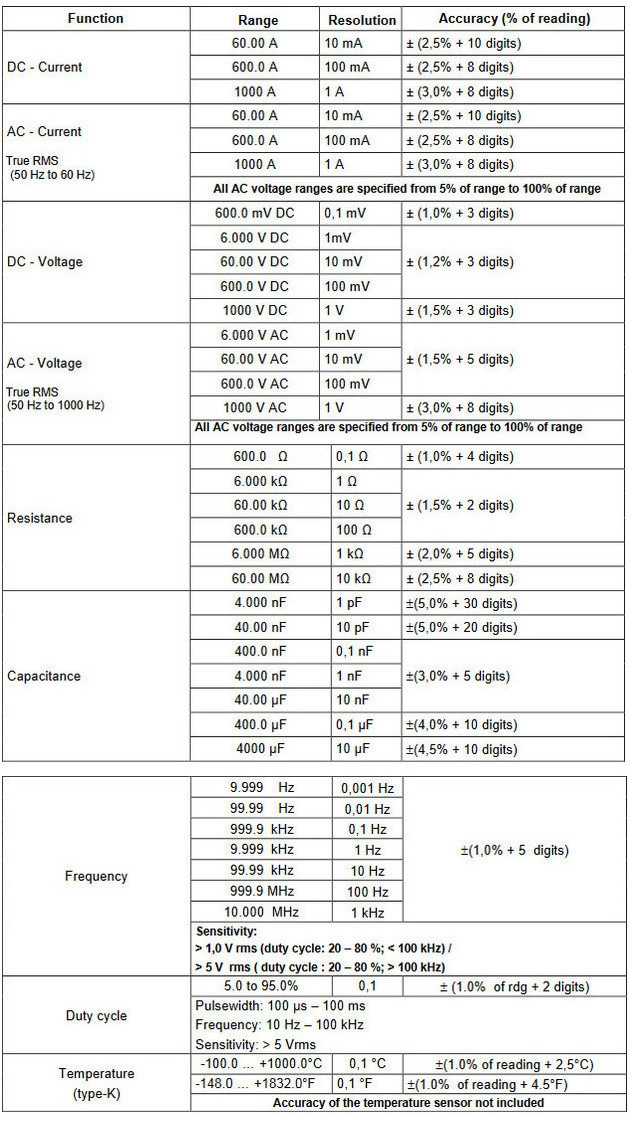 - Akcesoria: etui, przewody pomiarowe, czujnik termopary, bateria, instrukcja.