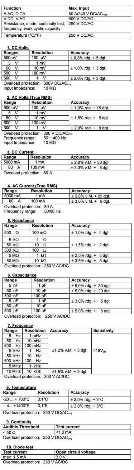 • Měřič dokáže měřit stejnosměrné a střídavé napětí, proud ve vodičích o průměru až 17 mm, elektrickou kapacitu a teplotu. Měření proudu až do 80 A/600 V při teplotě -20°:+760 °C.