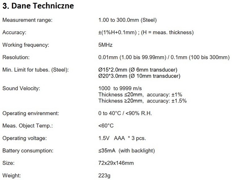 Urządzenie wyposażone jest w dwa czujniki do różnych grubości materiałów, które umożliwiają pomiary od 1 mm do 300 mm przy dźwięku o częstotliwości 5 MHz.