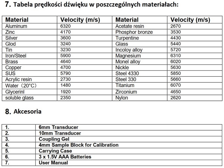 - Akcesoria: sondy 6 i 10 mm, żel kontaktowy, płytka kalibracyjna, aluminiowy futerał, baterie.