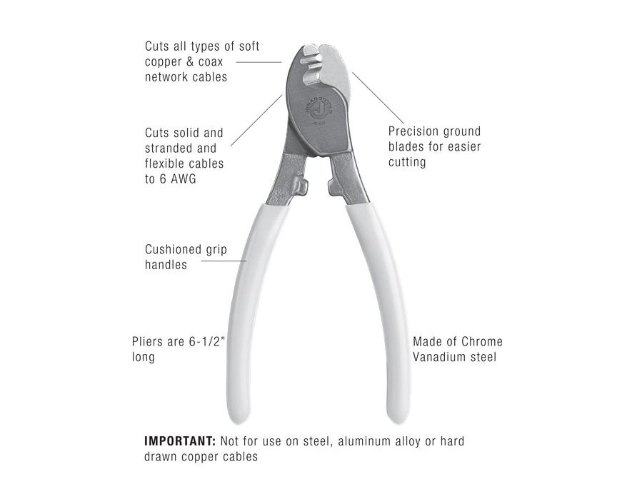 - Idealnie nadaje się do miękkich miedzianych kabli koncentrycznych i sieciowych oraz umożliwia cięcie litych, skręconych i elastycznych kabli do 6 AWG