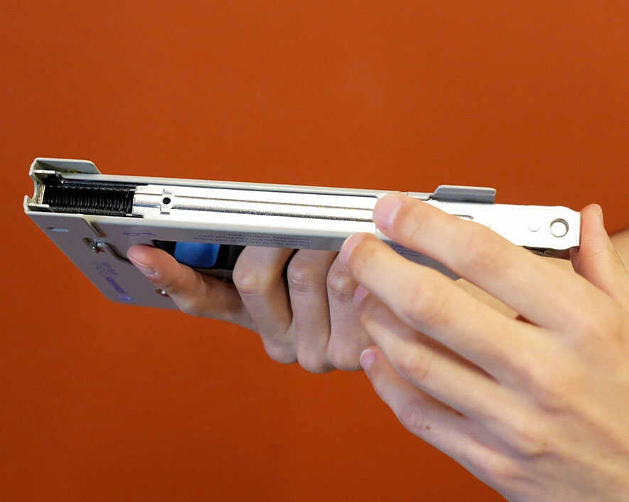 - Režim spouštěče, přepínač s voličem, umožňuje přednastavit sponku stisknutím rukojeti, umístit sponkovačku nad pracovní plochu nebo vodič/kabel pomocí vodítek a stisknutím spustit sešívání.