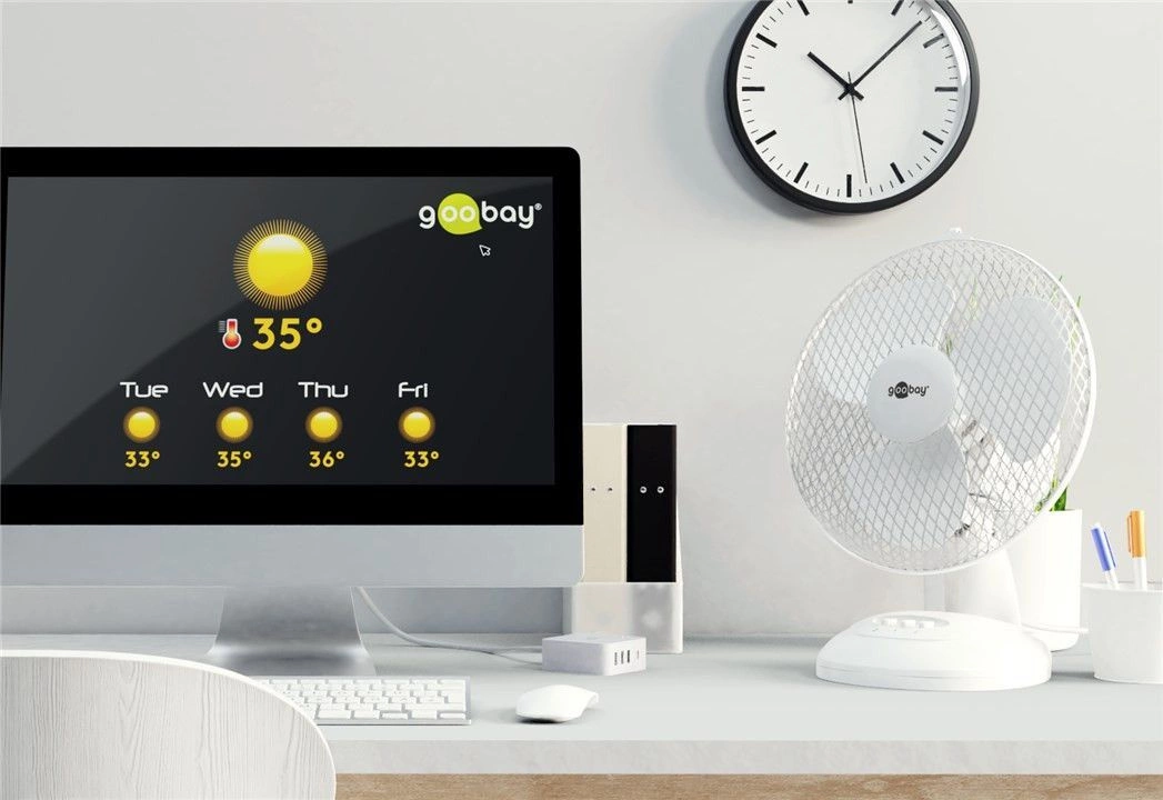 Wentylator biurkowy/stołowy - zapewnia przyjemny powiew wiatru w gorące dni. Rozmiar 9 cali (ok. 23cm). Moc 30W.
