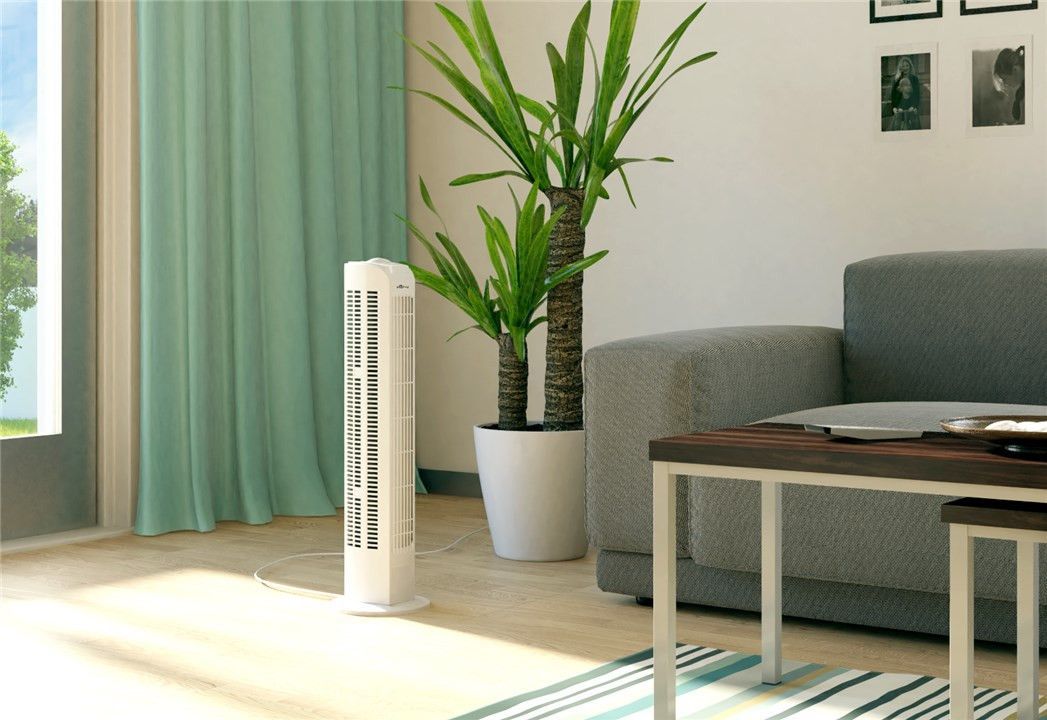 Wentylator stacjonarny typu wieżowego, inaczej kolumna nadmuchowa - zapewnia przyjemny powiew wiatru w gorące dni. Wysokość około 78 centymetrów. Moc 45W.