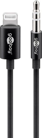 Kabel przyłączeniowy w kolorze czarnym. Umożliwia podłączenie urządzenia z gniazdem Apple Lightning (8-pin) do gniazda Jack 3,5mm; np. iPhone'a do gniazda AUX w samochodzie.