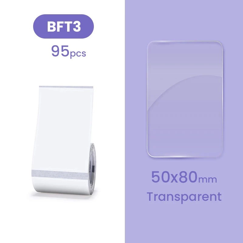 Průhledné etikety pro tiskárny Niimbot řady B. V roli je 95 kusů o rozměrech 50x80 mm. Etikety ve svislé poloze.