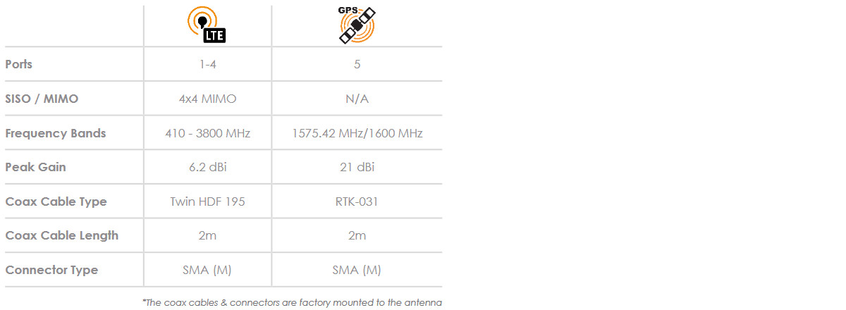MIMO-3-14 to wysokowydajna antena wieloczęstotliwościowa 5w1, zapewniająca cztery anteny komórkowe i antenę GPS / GLONASS. Cztery anteny komórkowe MIMO (dla 2G / 3G / 4G) obejmują współczesne pasma od 690 MHz do 2700 MHz, a także nowe pojawiające się widmo LTE i 5G dla pasm CBRS 450 MHz i 3,5 GHz, które staje się popularne w różnych międzynarodowych sieciach komórkowych LTE. Ultraszerokopasmowa wydajność anteny pozwala na użycie jej przez różnych operatorów i różne technologie i jest gotowa na przyszłe technologie komórkowe do 3,8 GHz dla aplikacji 5G. Piąta antena to wysokowydajny aktywny system GPS / GLONASS działający do -40 ° C. MIMO-3-14 przewyższa wydajność większości konkurentów dzięki dbałości o projekt tej wysokowydajnej anteny. Wzorce promieniowania wszystkich elementów promieniujących zapewniają doskonałą równowagę między wielokierunkowością, różnorodnością wzorców i dobrymi zdolnościami promieniowania na żądanej wysokości. Jest to ważne kryterium dla rynku transportowego i morskiego. dla którego antena została specjalnie zaprojektowana. Główne zastosowania to pojazdy komercyjne / przemysłowe, morskie, M2M i inne systemy IoT wykorzystujące szeroką gamę technologii radiowych, zachowując przy tym przyszłość w szerokim paśmie częstotliwości.
