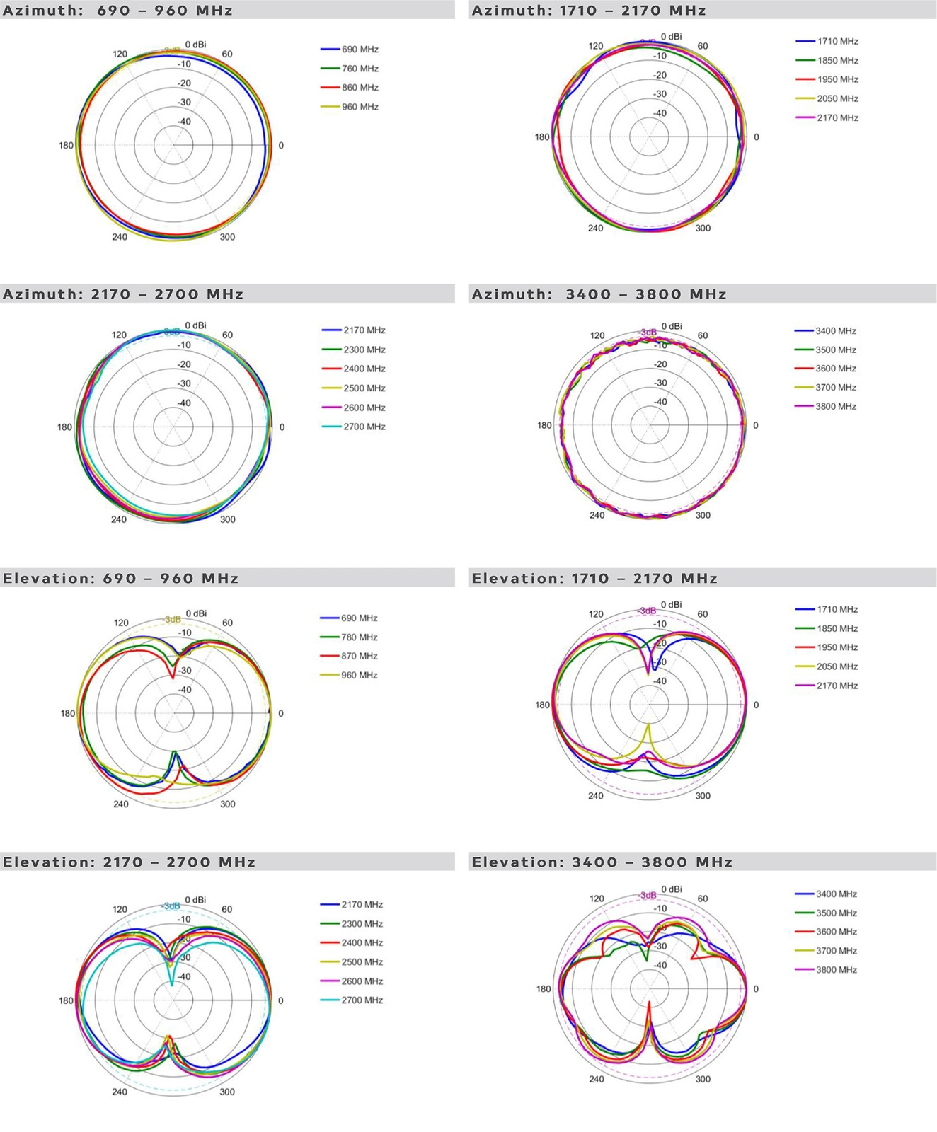 3 dBi je špičkový zisk pro všechna pásma od 698 do 3800 Mhz: graf vpravo nahoře znázorňuje zisk v každém pracovním pásmu.