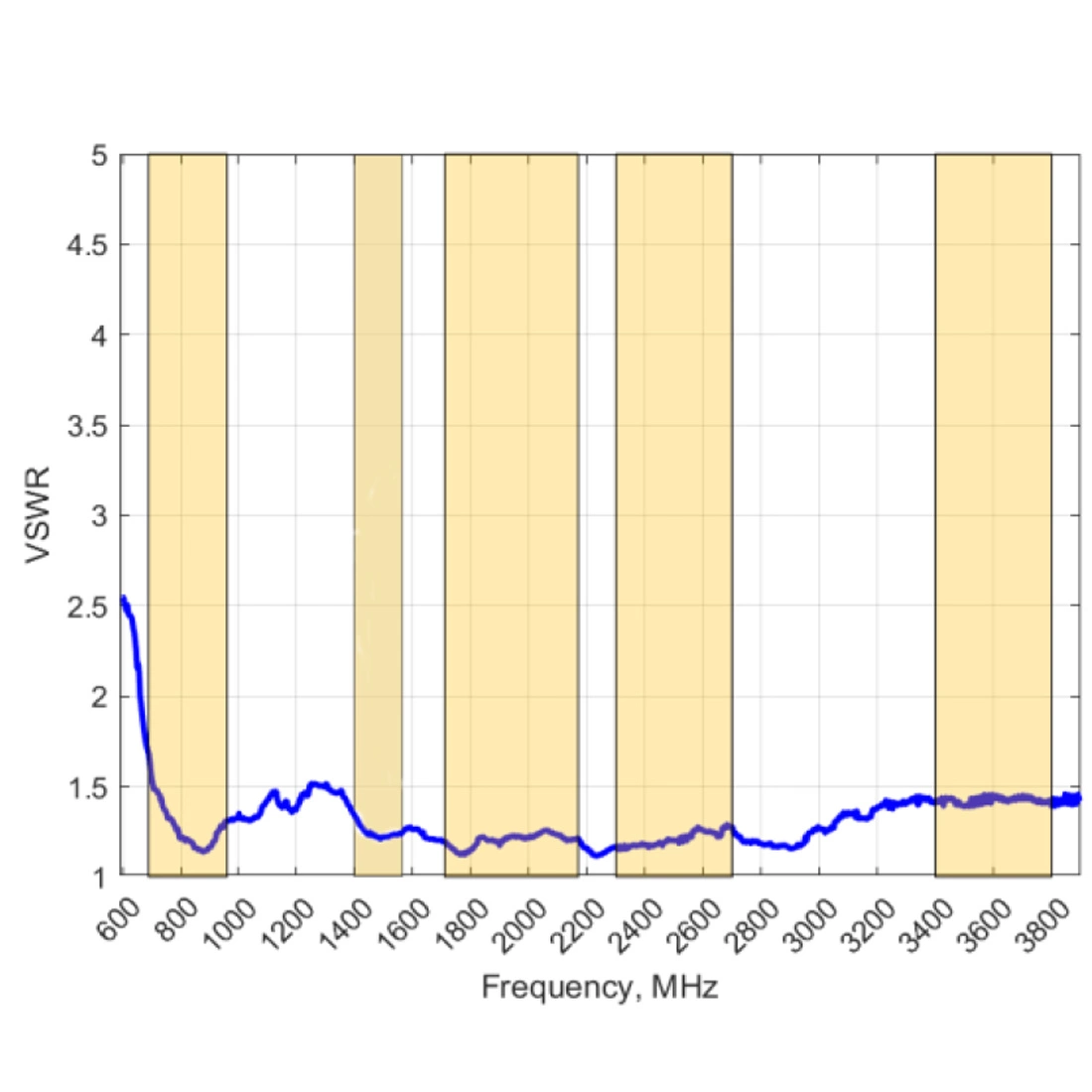 11 dBi to szczytowe wzmocnienie we wszystkich pasmach od 698 do 3800 MHz.