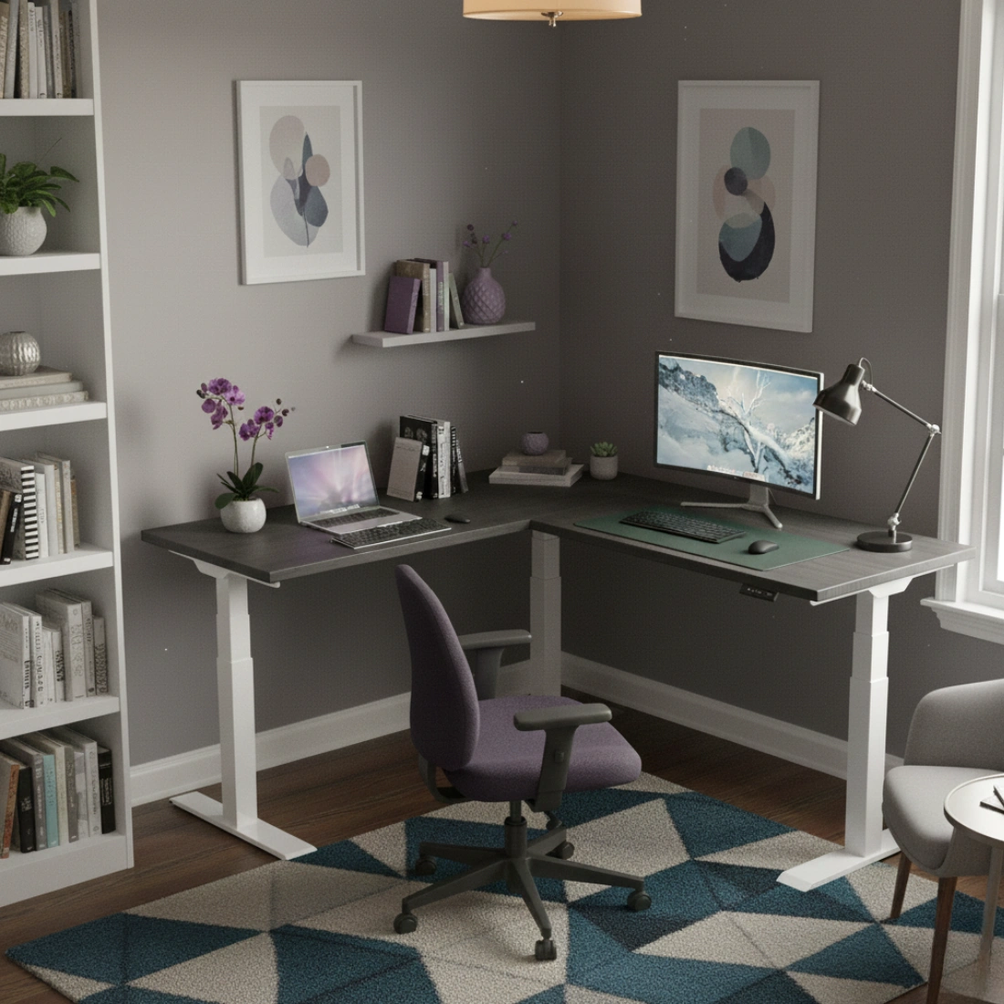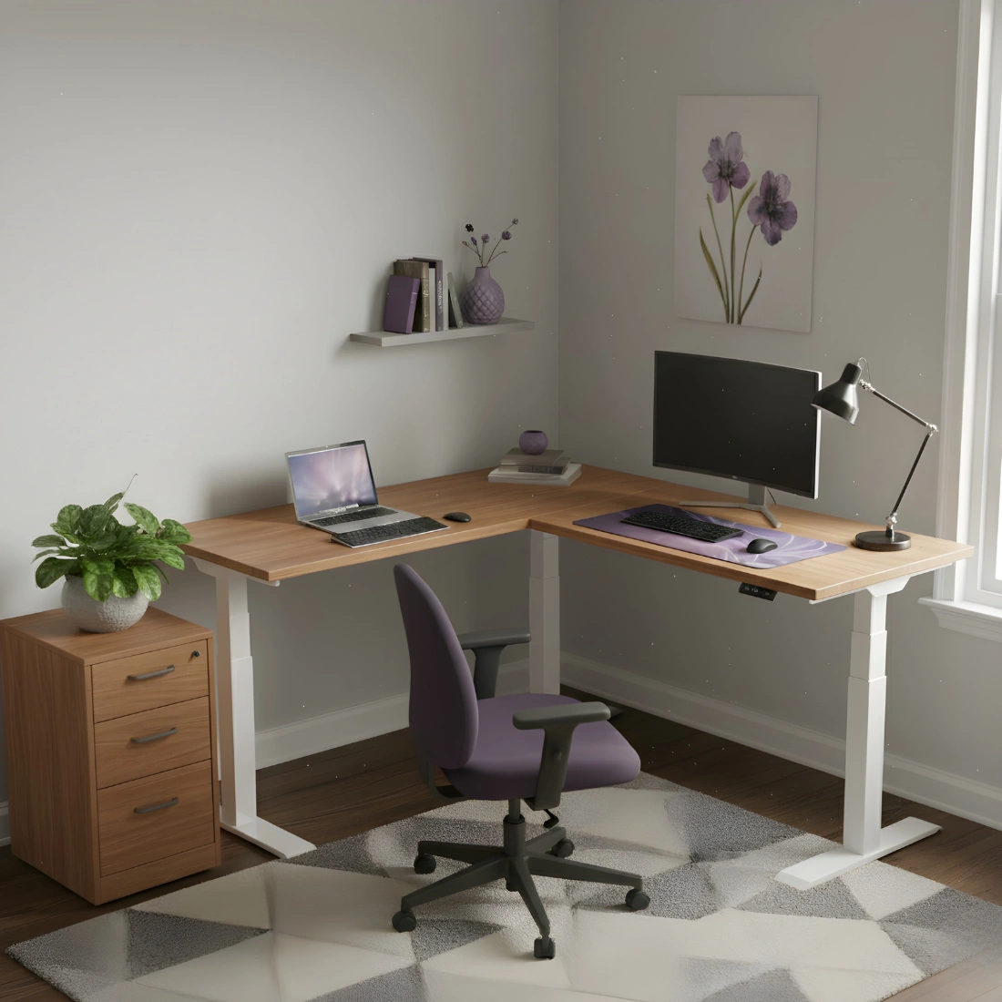 Ein einzigartiges Tischgestell, das es Ihnen ermöglicht, den Tisch Ihren Bedürfnissen entsprechend einzustellen. Sie können ihn in L-Form (Eckschreibtisch), in V-Form oder in I-Form (Standard) aufstellen. Er ist ideal für größere Schreibtische, da er eine große Arbeitsfläche bietet.