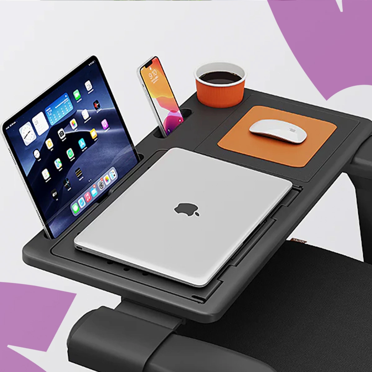 Der ergonomische Laptopständer ist eine stabile Stuhlunterlage, mit der Sie bequem arbeiten können, ohne am Schreibtisch sitzen zu müssen. Sie können ihn ganz einfach an die Spacetronik-Stühle der LUMBO-Serie montieren ! Sorgen Sie noch heute für Ihren Arbeitskomfort!