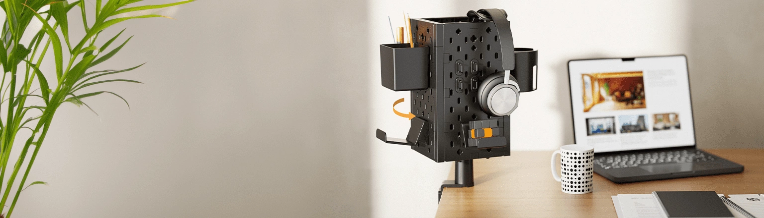 • Universelle Tischhalterung. Das modulare Design, die Möglichkeit der Montage über und unter dem Schreibtisch und die Drehbarkeit um bis zu 180 Grad ermöglichen die Anpassung an jeden Raum. Enthält Halterungen für Schreibwaren, Becher, Kopfhörer, Pads und