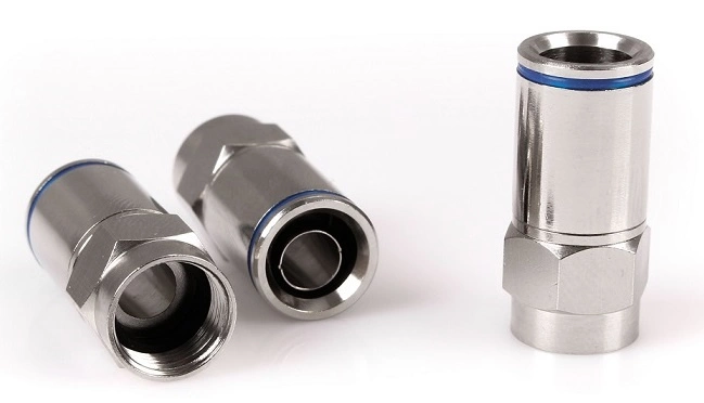 Selbstdichtender F-Typ-Stecker mit einem Durchmesser von 7,4 mm mit Dichtung für den Anschluss von Antennenkabeln. Der Stecker kann sowohl in Innenräumen als auch im Freien verwendet werden.