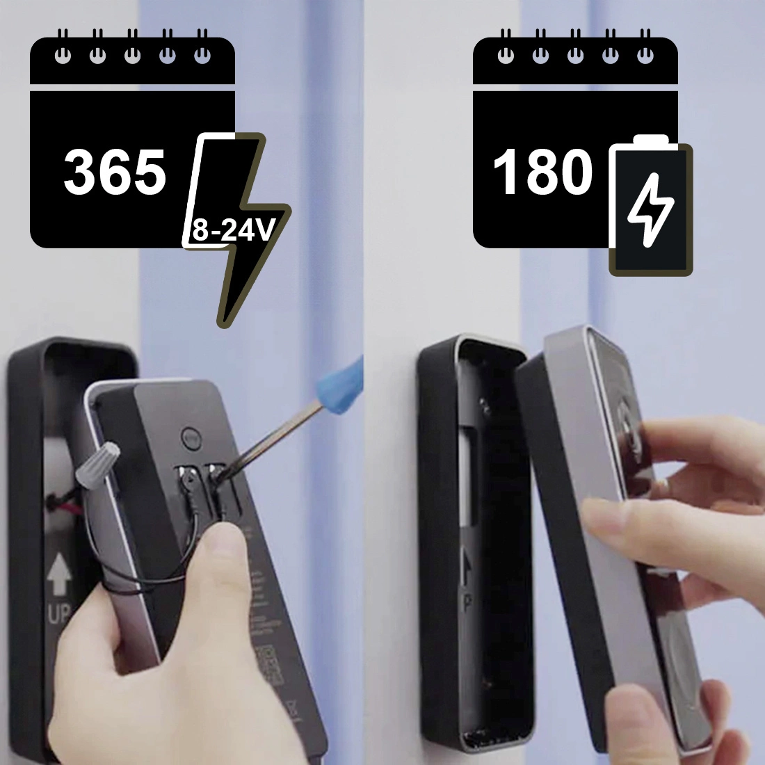 Stromversorgungsoptionen | Eingebaute Batterie (Batterielebensdauer 180 Tage) oder vorhandene Klingelverdrahtung (8?24 V) | Eingebaute Batterie (Batterielebensdauer 180 Tage) |