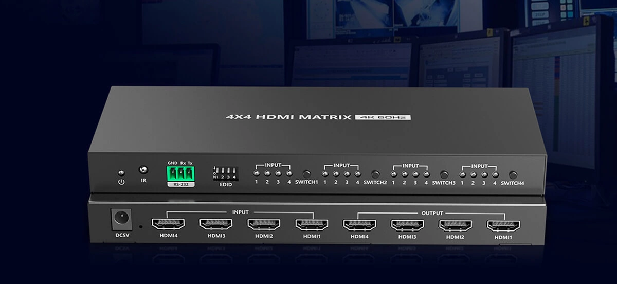 Die Matrix ist mit 4 HDMI-Eingängen und 4 HDMI-Ausgängen ausgestattet, so dass Sie 4 Eingänge auf 4 Displays in beliebiger Konfiguration anzeigen können. Das Gerät unterstützt eine Auflösung von 4K@60Hz und kann über eine Fernbedienung, Tasten oder über RS232 gesteuert werden.