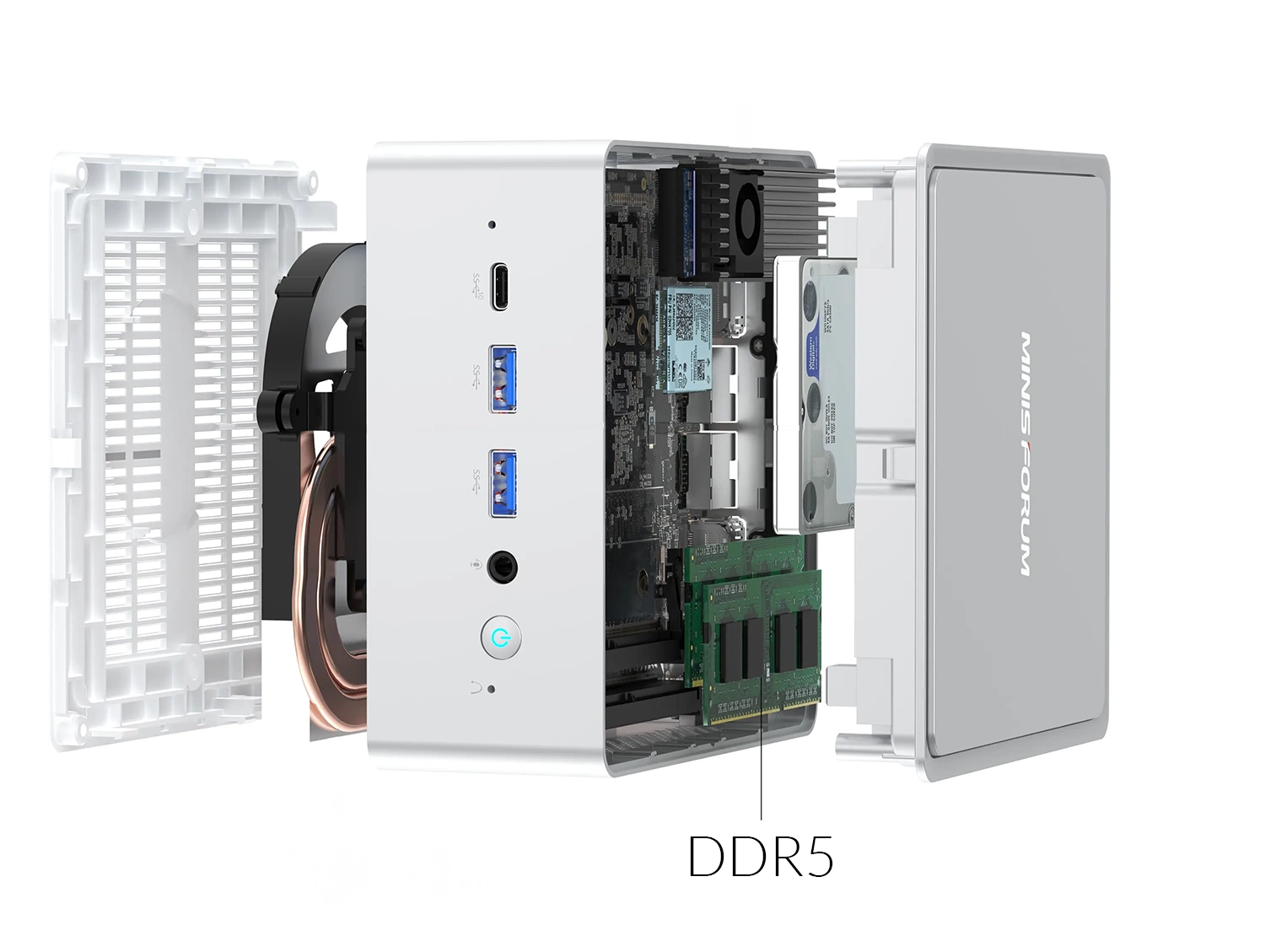 In der heutigen Zeit, in der sich die Technologie rasant weiterentwickelt, ist die Möglichkeit, Ihren PC mit neuen Komponenten zu erweitern, von entscheidender Bedeutung. Im Falle des Mini-PCs Minisforum NPB7 ist dies sehr einfach. Sie müssen nur auf die Oberseite des Gehäuses drücken, um es zu öffnen. Der Computer ist für den Einbau eines zweiten Laufwerks vorbereitet. Und zwar dank eines Steckplatzes für eine 2,5"-SATA 3.0-Festplatte mit bis zu 6 Gb/s. Darüber hinaus können Sie den Arbeitsspeicher auf bis zu 64 GB und die SSD auf bis zu 2 TB erweitern. So können Sie Ihren Minisforum NPB7 Computer garantiert lange nutzen.