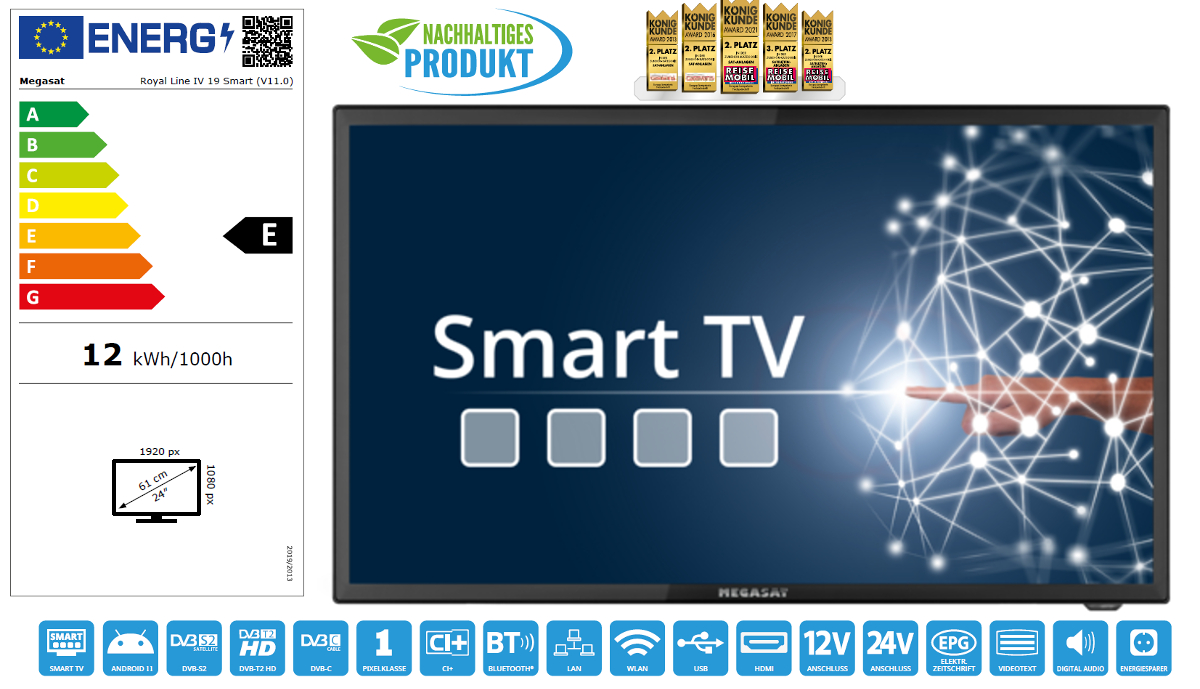 • 24" SMART TV für Autos, Wohnmobile, Boote. Widerstandsfähig gegen Vibrationen und Stöße. Eingebauter DVB-S/S2/T/T2/C H-Digital-Tuner.265, USB-Player, Bluetooth-Funktion und CI+ Slot, TV ohne Standfuß