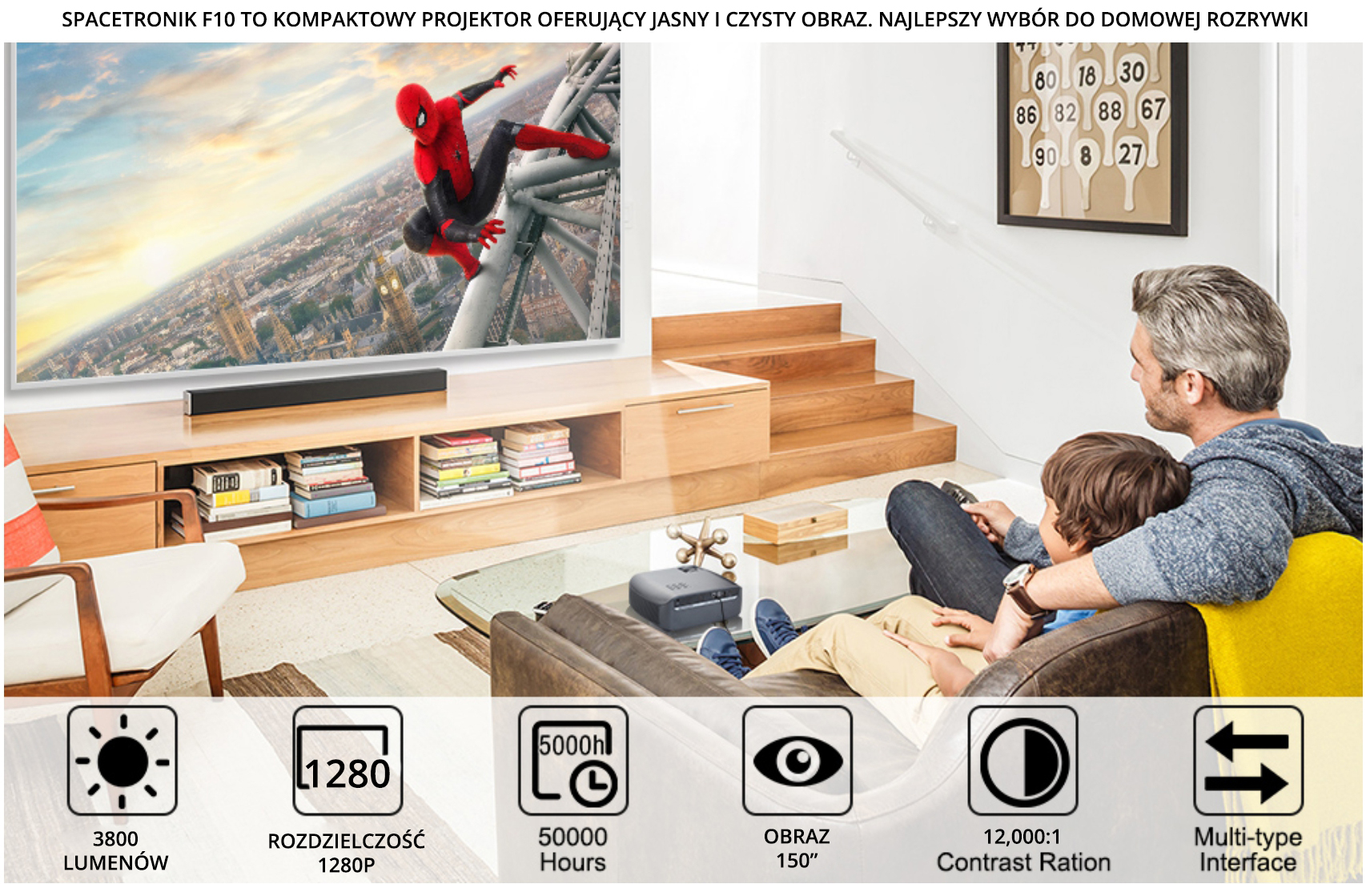Die F10-Serie ist ideal für alle, die eine bequeme Möglichkeit zur Multimedia-Wiedergabe suchen. Das Produkt verfügt über die höchste Auflösung in seiner Klasse - 1280x720px, was ein natürliches und scharfes Bild garantiert. Der Projektor zeichnet sich durch eine hohe Bildhelligkeit von 3800 Lumen aus. Komfortabler Empfang ausgewählter Multimedia-Inhalte in abgedunkelten Räumen. Dank des eingebauten Lautsprechers können Sie Ihr Wohnzimmer in einen kleinen Kinosaal verwandeln. Der Spacetronik F10 ist ein kompakter Projektor, der die Bedürfnisse vieler Nutzer befriedigen wird.